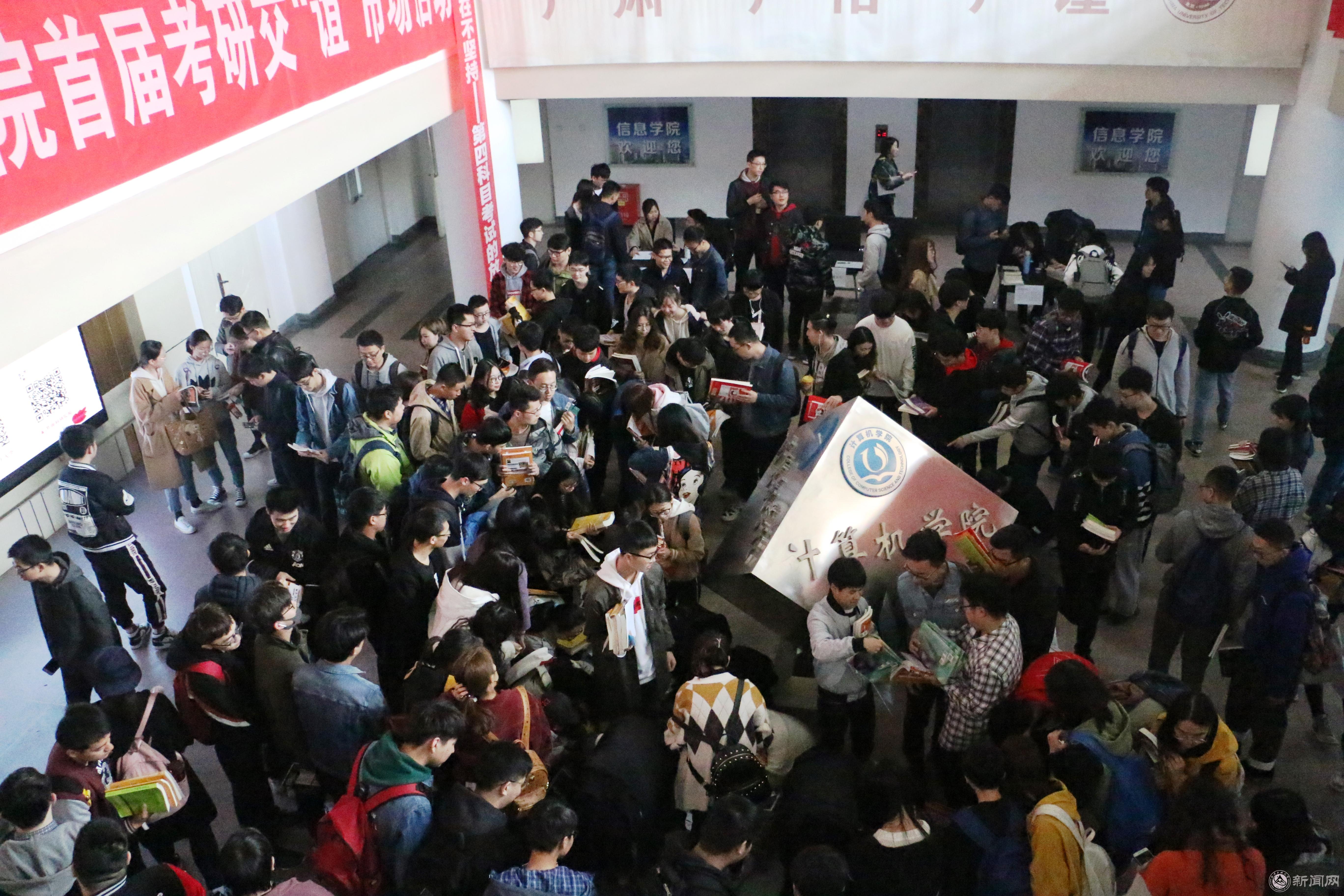 活动伊始,院长马礼简要总结了学院近年的考研成绩,分析了当前的考研形势,鼓励同学们要树立信心、梳理信息、整合资源,做好考研经验的交流和传承,为备战2020年考研做好充分准备。随着马礼院长宣布信息学院首届考研交“谊”市场活动开幕,两条包含激励的条幅从天而降:“考研赢在起跑线——第一志愿院校的选择;考研输在不坚持——第四科目考试的放弃”。