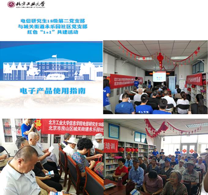随着信息化时代的日益发展,电子产品应用越来越广泛,为人们的吃穿住行带来了便捷的同时,也在潜移默化中改变着人们的生活方式,在这种转变的过程中,老年人因思维习惯和接受新事物能力方面的限制阻碍了其享受这一大福利,老年人对便捷生活方式的渴望与不能熟练掌握电子产品的使用之间发生了矛盾。为此,近日,信息学院电信研究生18级第二党支部与北京市房山区城关街道永乐园社区党支部开展了一场化解这一“矛盾”的红色“1+1”共建活动,为永乐园社区党支部老年党员们举办了一场题为“常用电子产品的使用指南”培训讲座,支部党员及积极分子20余人参加了此次活动。