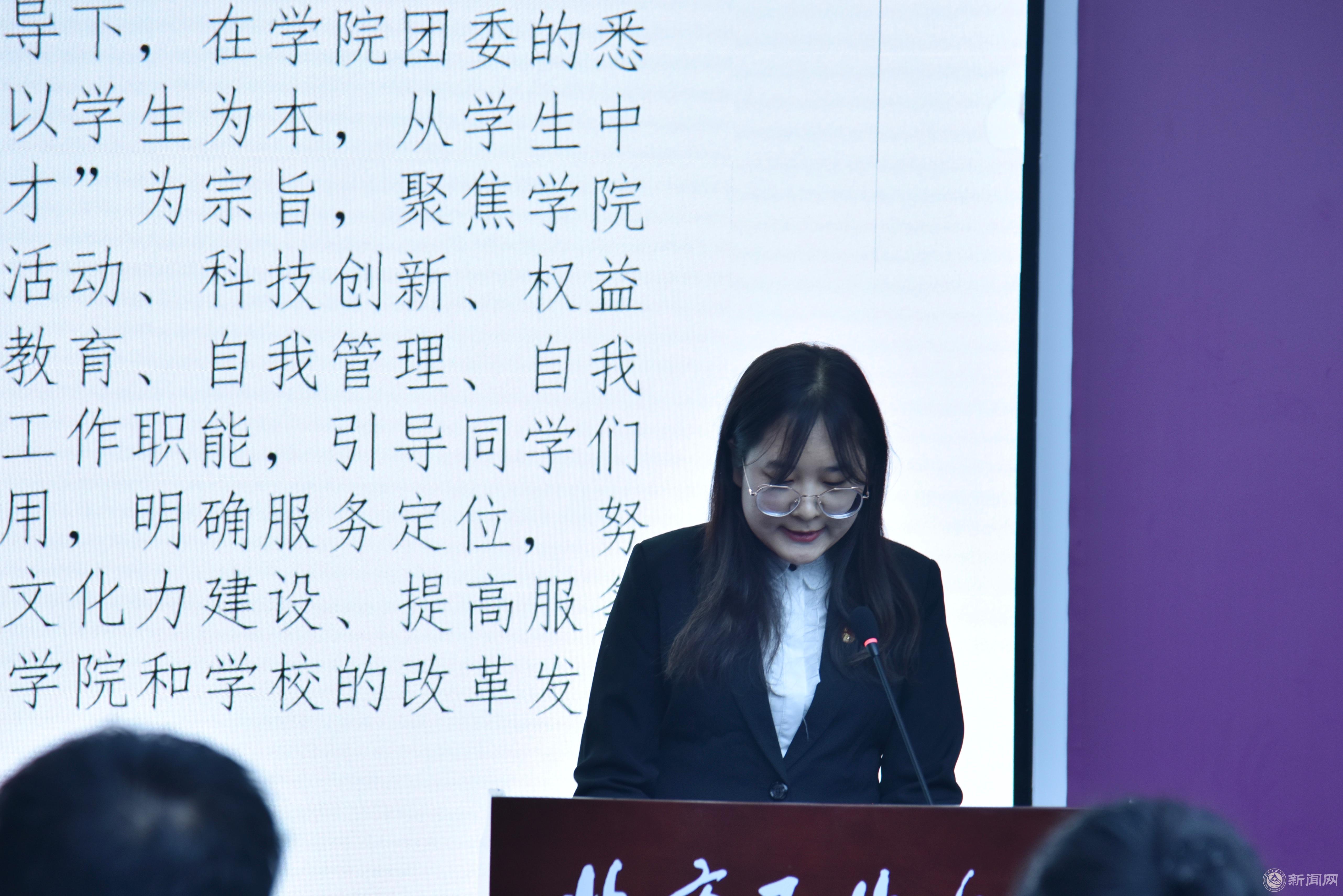 学生会主席窦蕾代表学院第一届第二任学生会作了题为《践行初心使命,勇于担当作为,努力创建新时代服务型学生组织》的工作报告。报告回顾了自上次学生代表大会以来,学生会围绕学院中心工作,积极发挥学生自我管理、自我教育、自我服务、自我监督的功能,在思想引领、学风建设、校园文化建设、学生干部培养、素质教育、组织建设和服务首都等方面积累的成功做法,深入分析了存在的问题和不足,就下一阶段学生会工作做了计划安排。