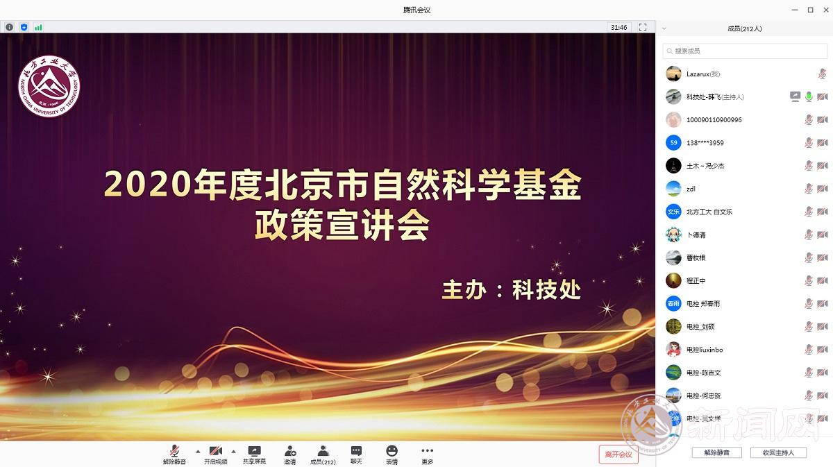 6月24日上午,为进一步提升基金项目申报率和资助率,科技处组织召开了2020年北京市自然科学基金项目宣讲会。因疫情原因,本次宣讲会采用了线上会议的模式,共计210余位教师参加了本次宣讲会,会议由科技处副处长韩飞主持。