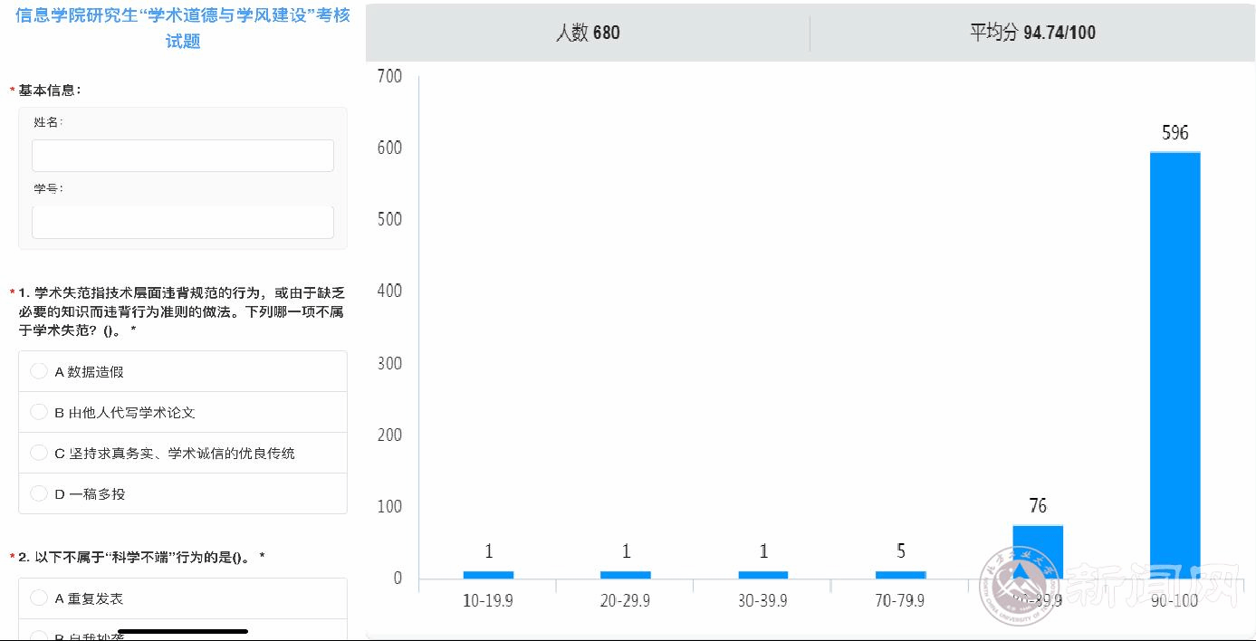 同时,学院组织全体研究生参加了“学术道德与学风建设”知识考核。考核以线上答题形式进行,对象为学院全体研究生,其中75%的学生一次性通过考核,其余学生通过学习也顺利完成考核,此次考核成绩将纳入学院研究生政治思想表现考核体系。通过学习和测试,同学们纷纷表示对学术研究和论文发表方面的基本道德准则有了更清晰的认识,一定会遵守学术规范,抵制学术不端。