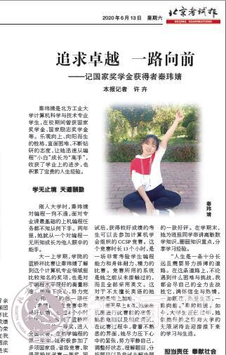 国家奖学金获得者当代大学生中的佼佼者,是品学兼优学生的代表。日前,《北京考试报》在2020年6月13日第4、5版和6月27日第8、9版对米兰国家奖学金获得者秦玮婧、杨晓阳、 和文辉同学的事迹进行了报道,体现了北方工大学生在磨砺中出彩,在奋斗中升华的精神风貌。