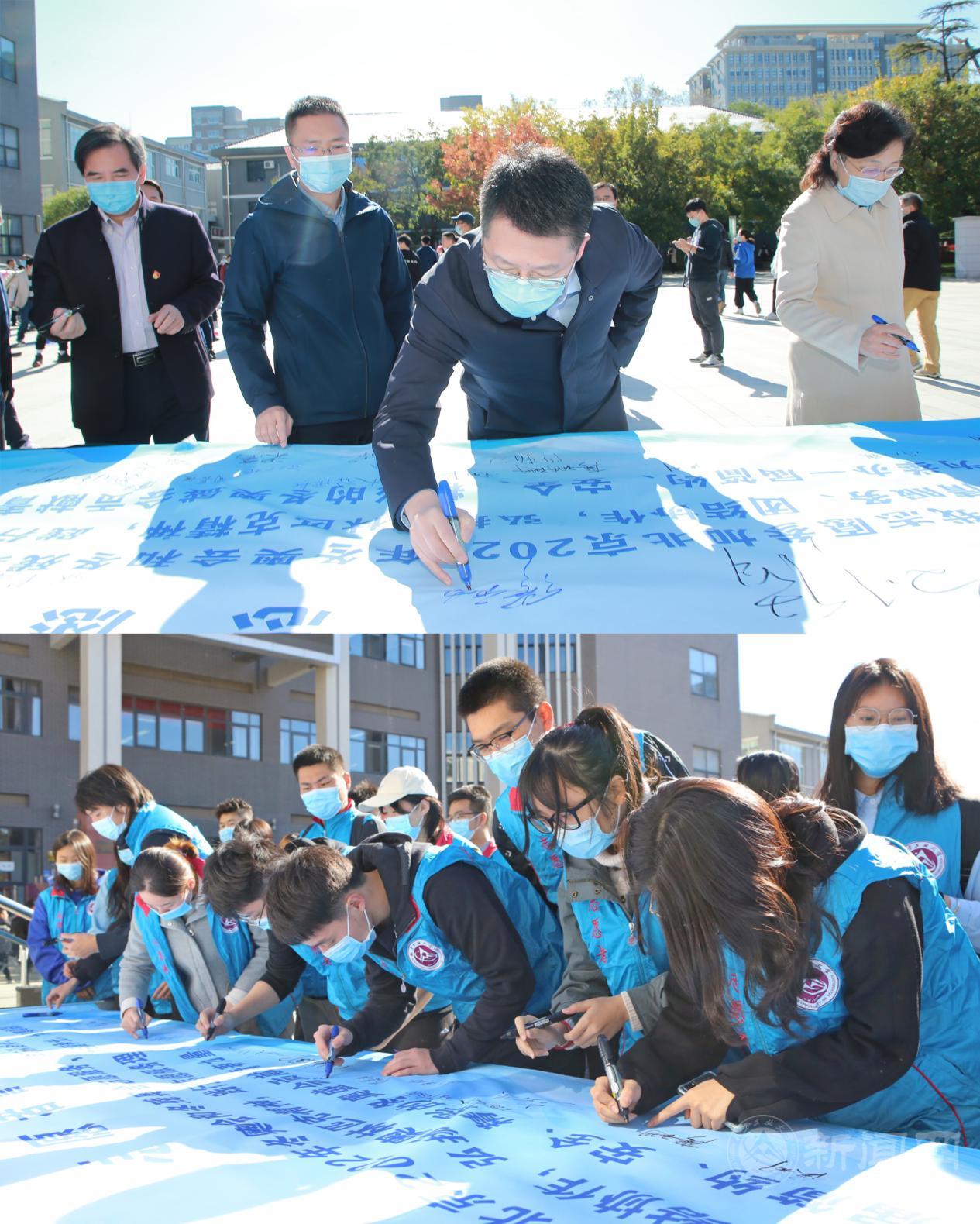 校领导与志愿者们在冬奥志愿者誓词卷轴上签名