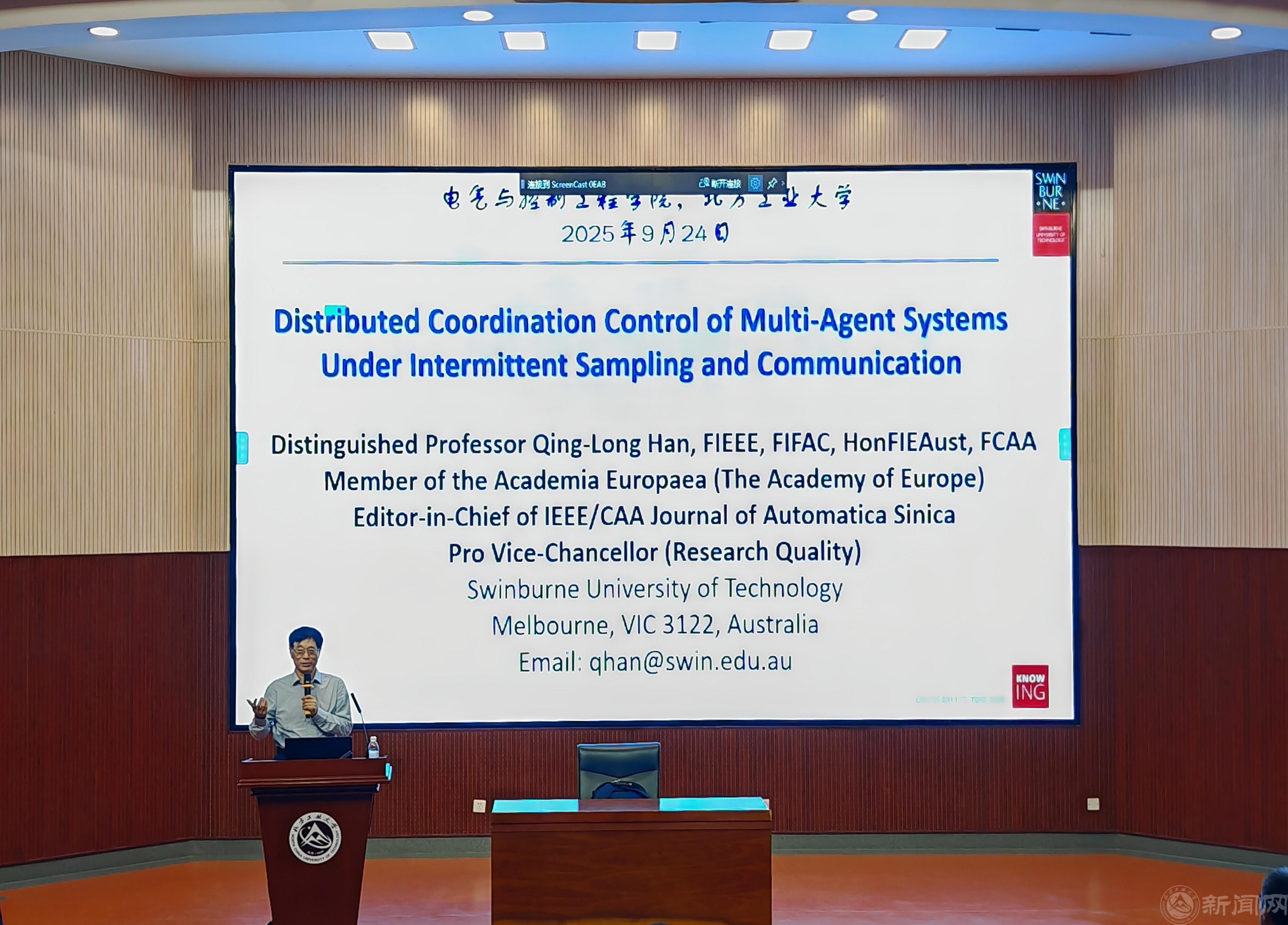 9月24日,欧洲科学院院士、澳大利亚斯威本科技大学副校长韩清龙教授在文化会堂为米兰控制科学与工程学科博士新生讲授了“控制科学与工程前沿专题”开学第一课。韩清龙院士以“Distributed Coordination Control of Multi-Agent Systems Under Intermittent Sampling and Communication”为主题,为博士生带来了一场前沿学术盛宴。报告由电气与控制工程学院院长董哲主持。