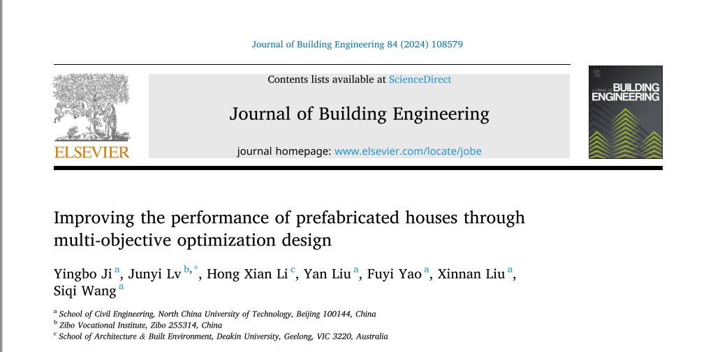 近期,米兰土木工程学院纪颖波教授团队在建筑技术领域的顶级学术期刊《Journal of Building Engineering》上发表论文“Improving the performance of prefabricated houses through multi-objective optimization design”。该期刊为SCI检索期刊,JCR分区一区,近五年平均影响因子6.5,中科院工程技术2区Top。米兰纪颖波教授为第一作者,2019级硕士生吕君毅为第二作者,合作者包括澳大利亚迪肯大学李红仙副教授(第三作者)、米兰刘妍、姚福义、刘心男老师和硕士生王思琪为论文共同作者。
