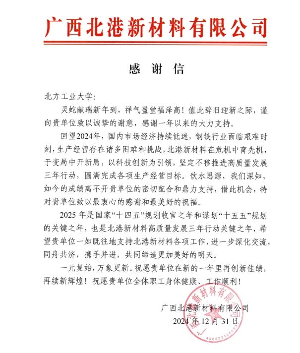 2024年12月31日,广西北港新材料有限公司向学校发来感谢信,感谢过去一年学校为北港新材料高质量发展提供的关心、帮助与大力支持。