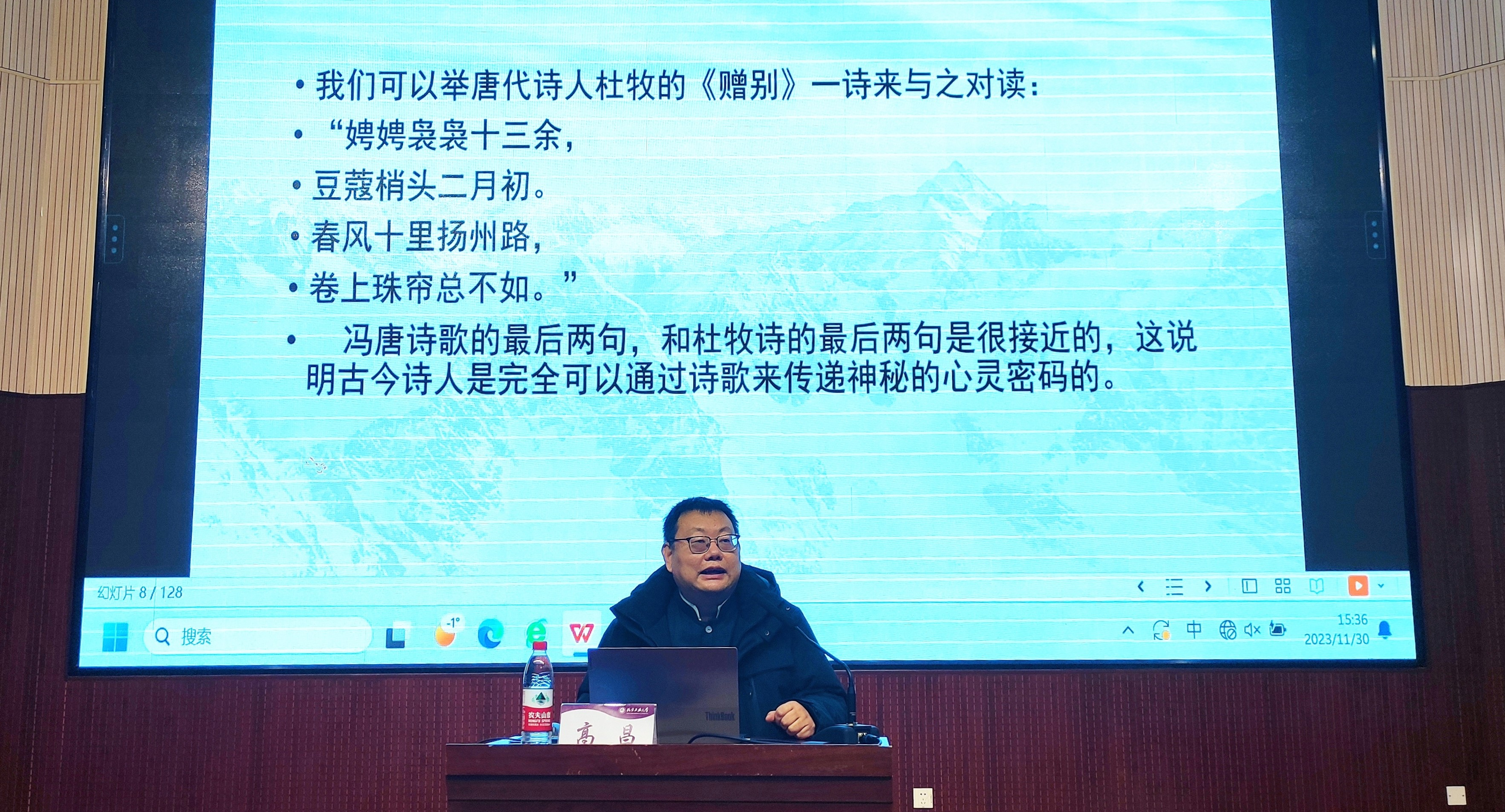 11月30日下午,新工科人文讲堂暨春霖美育讲堂之“古典诗词绝句的秘密”举办。讲座邀请《中国文化报》理论部主任高昌主讲,机械与材料工程学院150余名师生参加了本次讲座。机械与材料工程学院党委书记王文革主持讲座。绝句是我国古典诗词重要的体裁形式,涌现出大量脍炙人口的经典之作。了解绝句的结构特征、创作手法,有助于人们进一步欣赏和理解绝句既受诗人喜爱也受读者欢迎的原因。在讲座中,高昌从绝句的分类出发,介绍了绝...